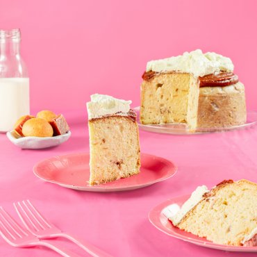 Tres Leches De Almojabana Y ArequipeBizcocho de vainilla con trocitos de almojábana, bañado en mezcla de tres leches con un sutil toque de canela, cubierto con arequipe y crema...