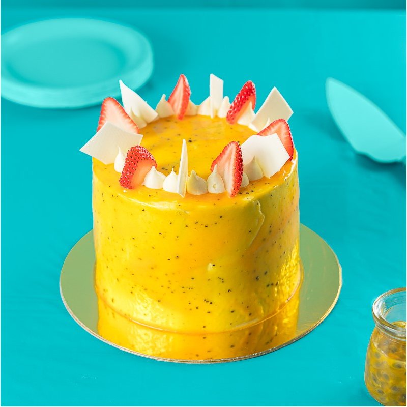 Suaves capas de torta de vainilla con un toque de ralladura de limón, rellenas con crema de yogurt veteada con maracuya y salsa de maracuya.